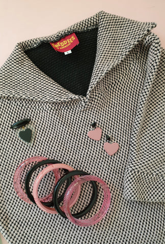 This Freddies of Pinewood top is perfect for wandering the town, arm-in-arm with your beloved! Build a romantic stack of Krystal Prystal, Elsie and Black Imogen bangles. Then finish your look with our all-new Beau Heart Earrings and Belinda Bakelite Reproduction Love Heart Brooch for pinup perfect style!