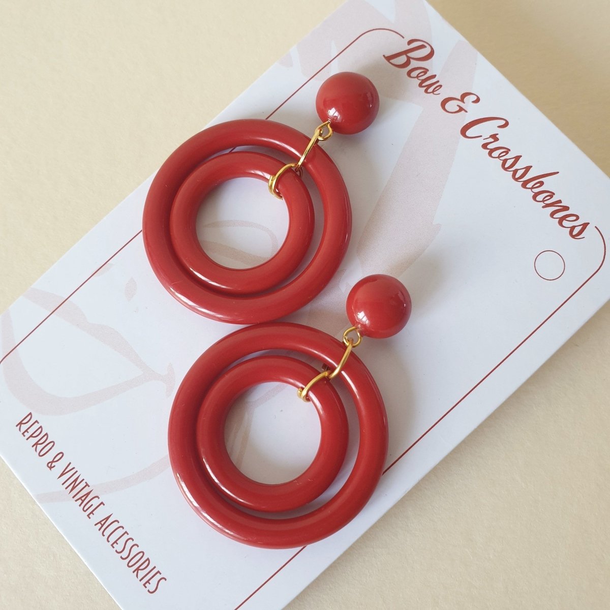 Jewellery trends come and go but fakelite is a modern classic! Our DOT Double Hoop Earrings feature two free dangling hoop charms in Cherry Red.